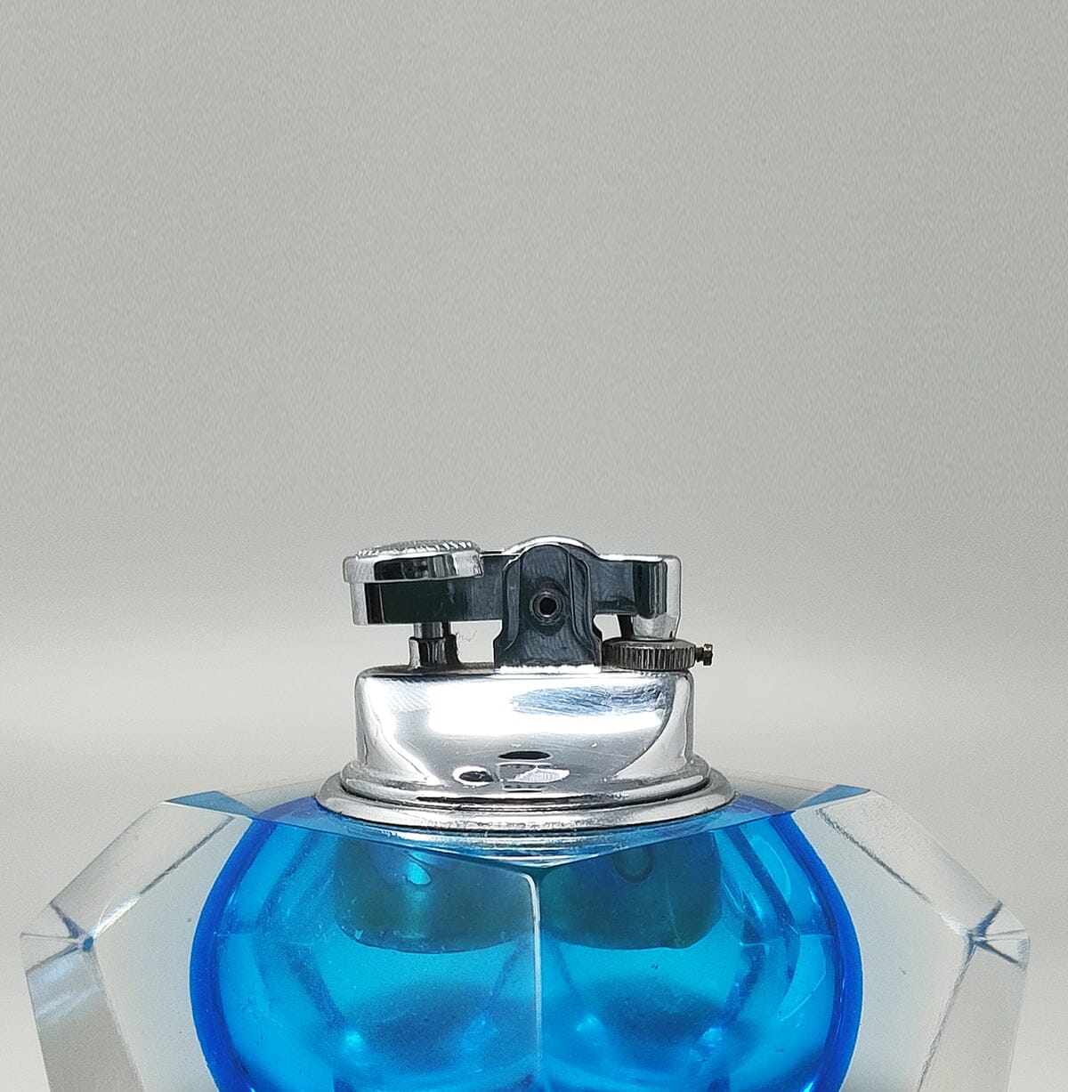 1960 Stunning  table lighter in Murano sommerso glass by Flavio Poli for Seguso. Made in italy. Handcrafted in Italy using the iconic Murano sommerso glass technique, it features a deep, vibrant blue core suspended within faceted, crystal-clear glass.This piece perfectly balances mid-century modern aesthetics with timeless elegance. It remains in excellent ondition and is fully functional—a rare find for collectors of fine Italian art glass.