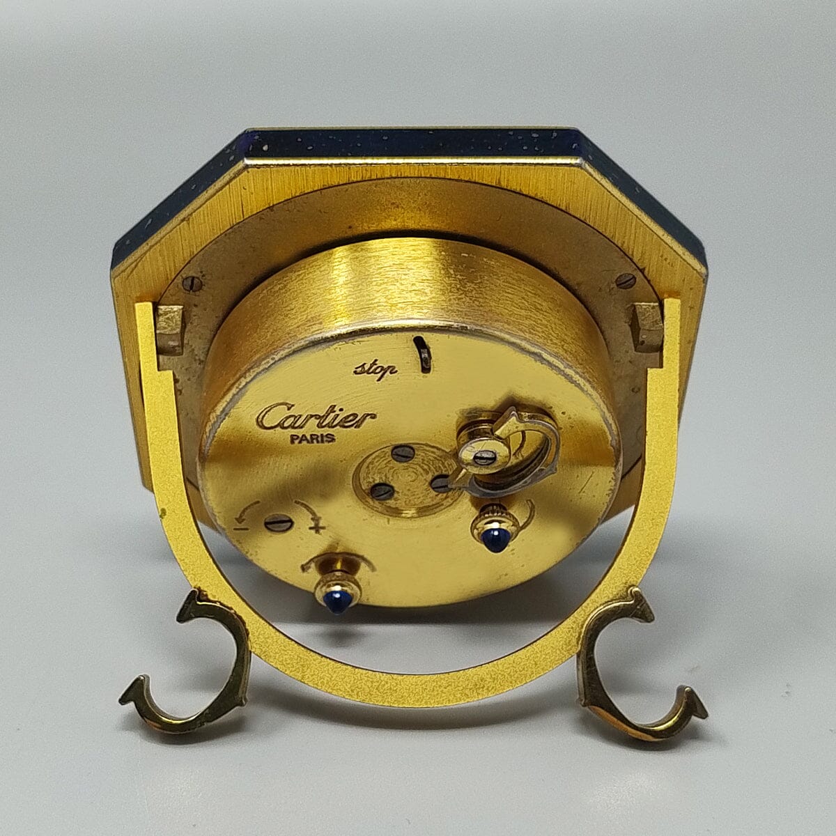 It's lapis lazuli and golden metal with manual winding. Clock case numbered 7507 10267. With original case, lined with red leather and with instructions. It works perfeclty and is in excellent condition.