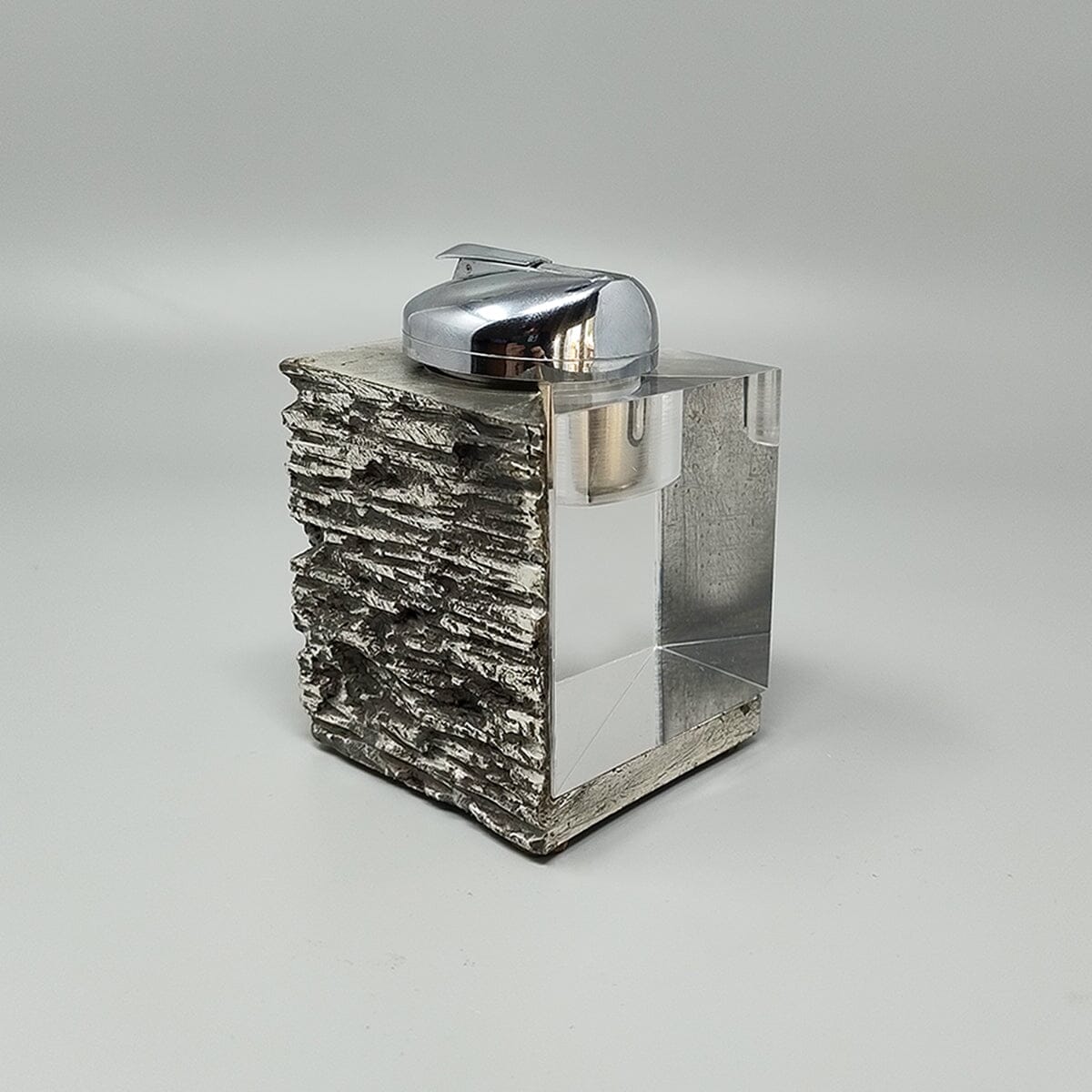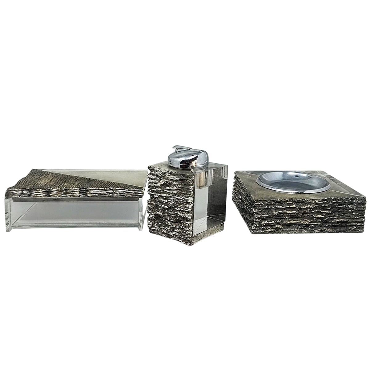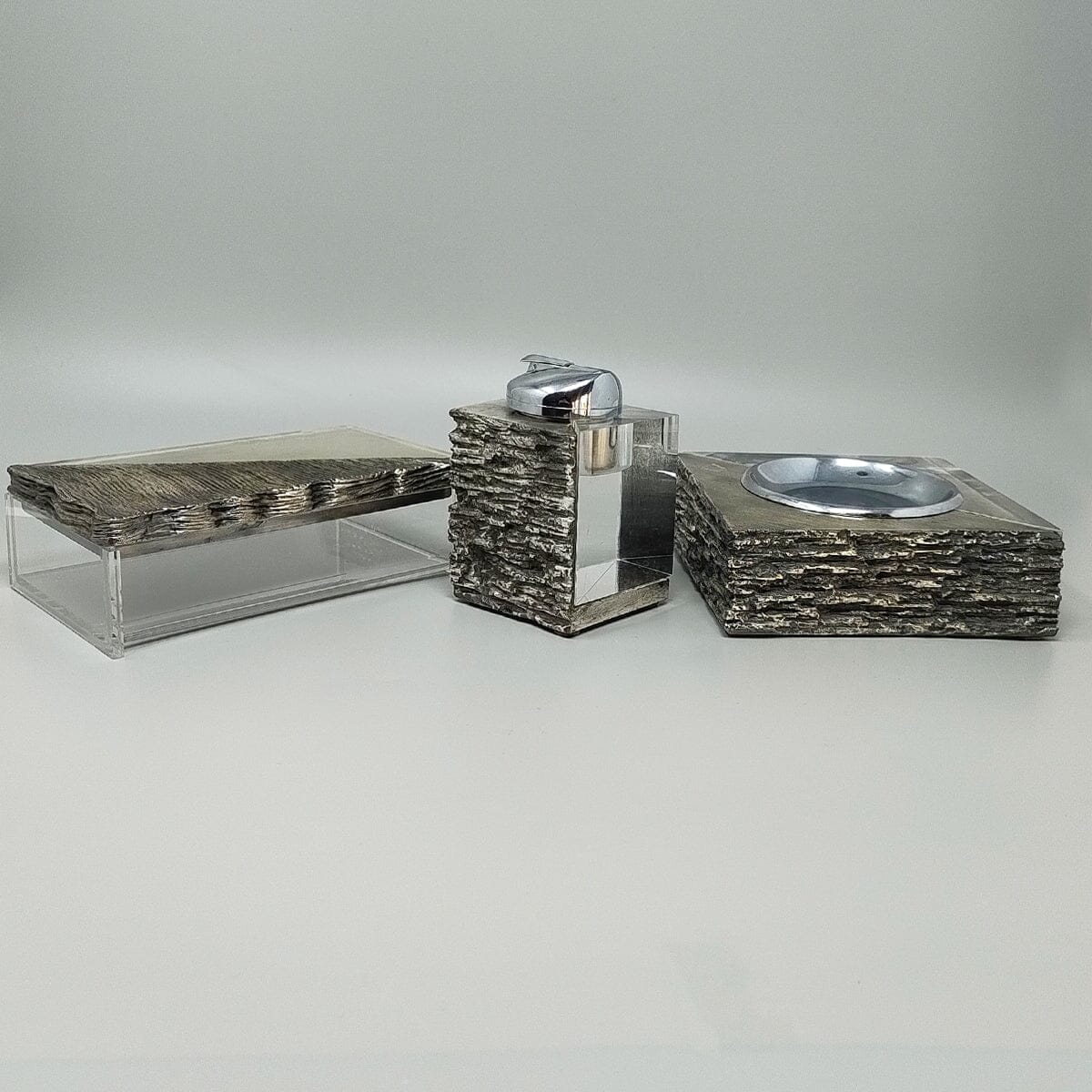 1970s Stunning brutalist smoking with ashtray, box and table lighter, everything is handmade carved in metal and plexiglass. The table lighter works perfectly. Made in Italy. This smoking set is in excellent condition.