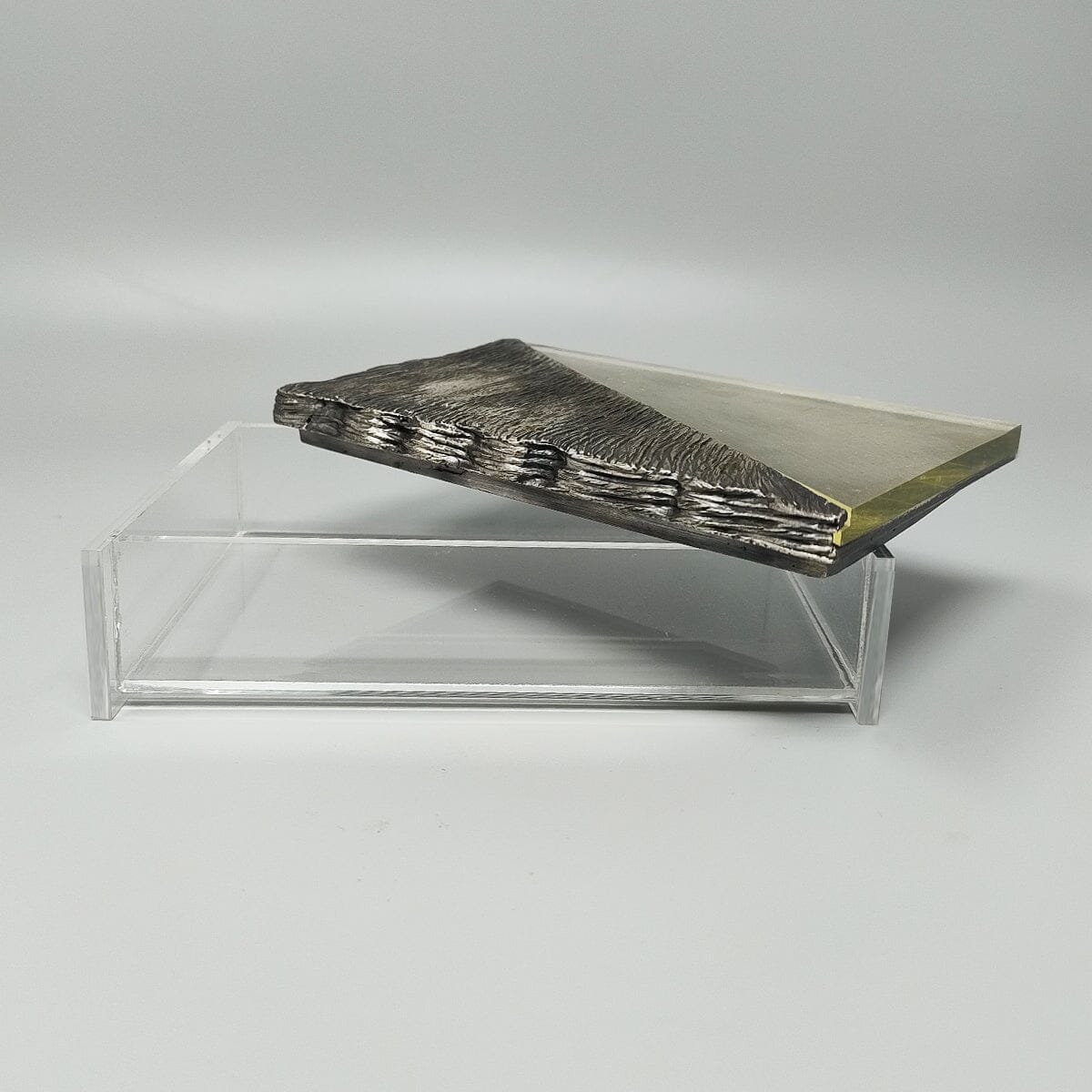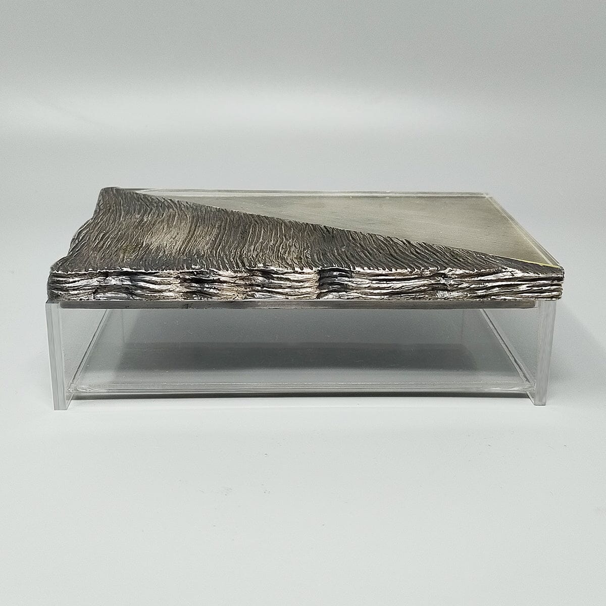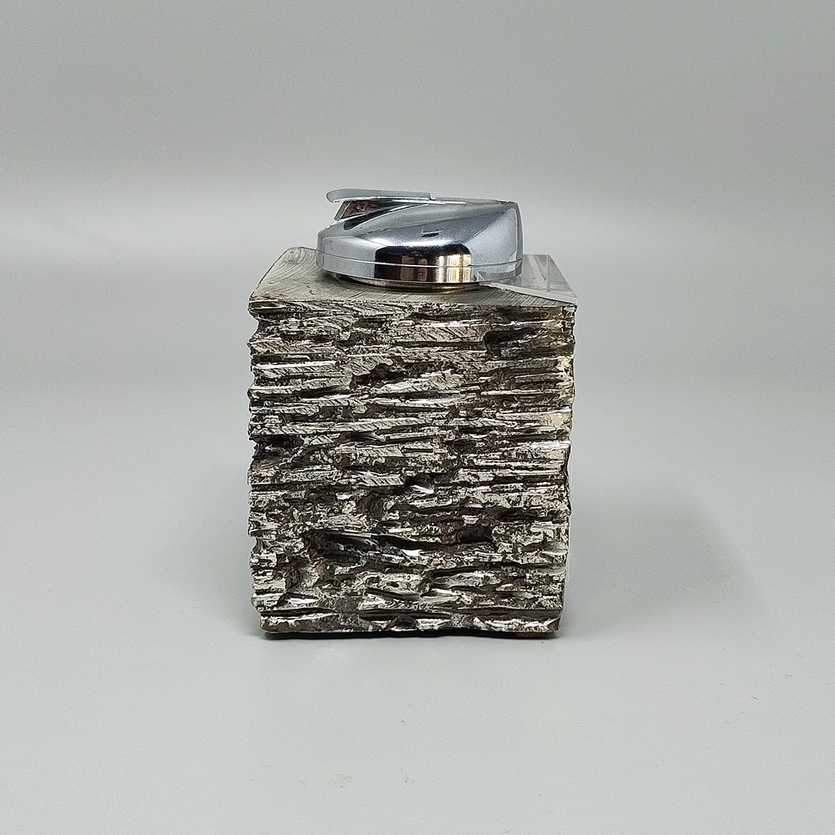 1970s Stunning brutalist smoking with ashtray, box and table lighter, everything is handmade carved in metal and plexiglass. The table lighter works perfectly. Made in Italy. This smoking set is in excellent condition.