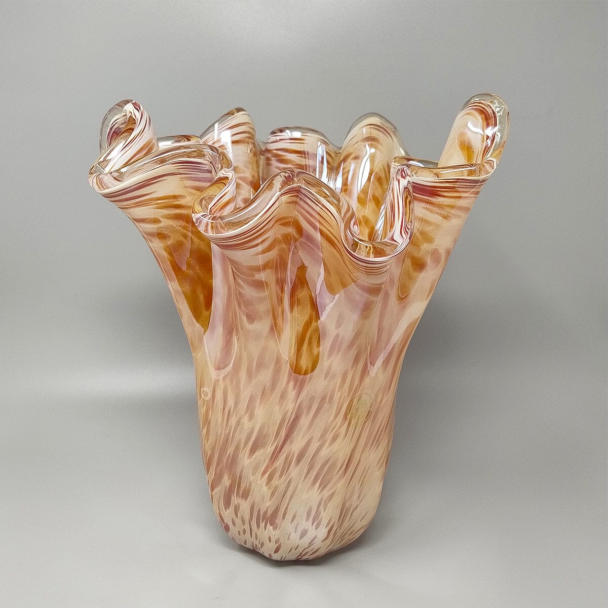 1970s A superb example of Italian artistry, this Murano glass vase by Michielotto showcases the legendary "handkerchief" technique. Handcrafted in Murano, Italy, its dramatic, flowing silhouette captures the light with exceptional depth and movement. With its rich tones and iconic draped form, this piece is a sophisticated addition to any collection of fine Venetian glass or high-end vintage decor.