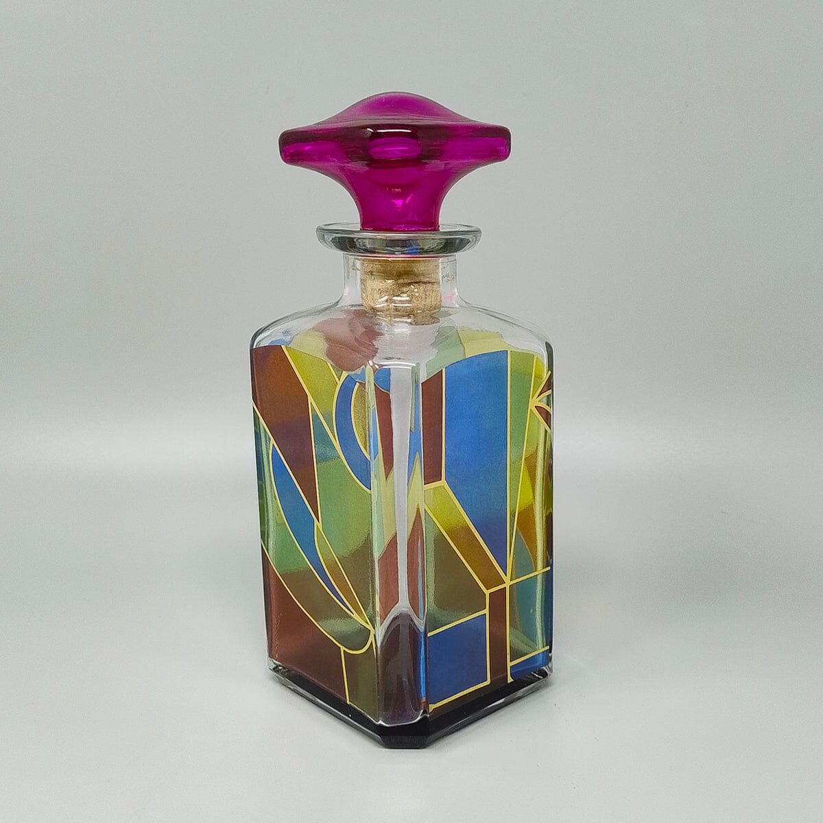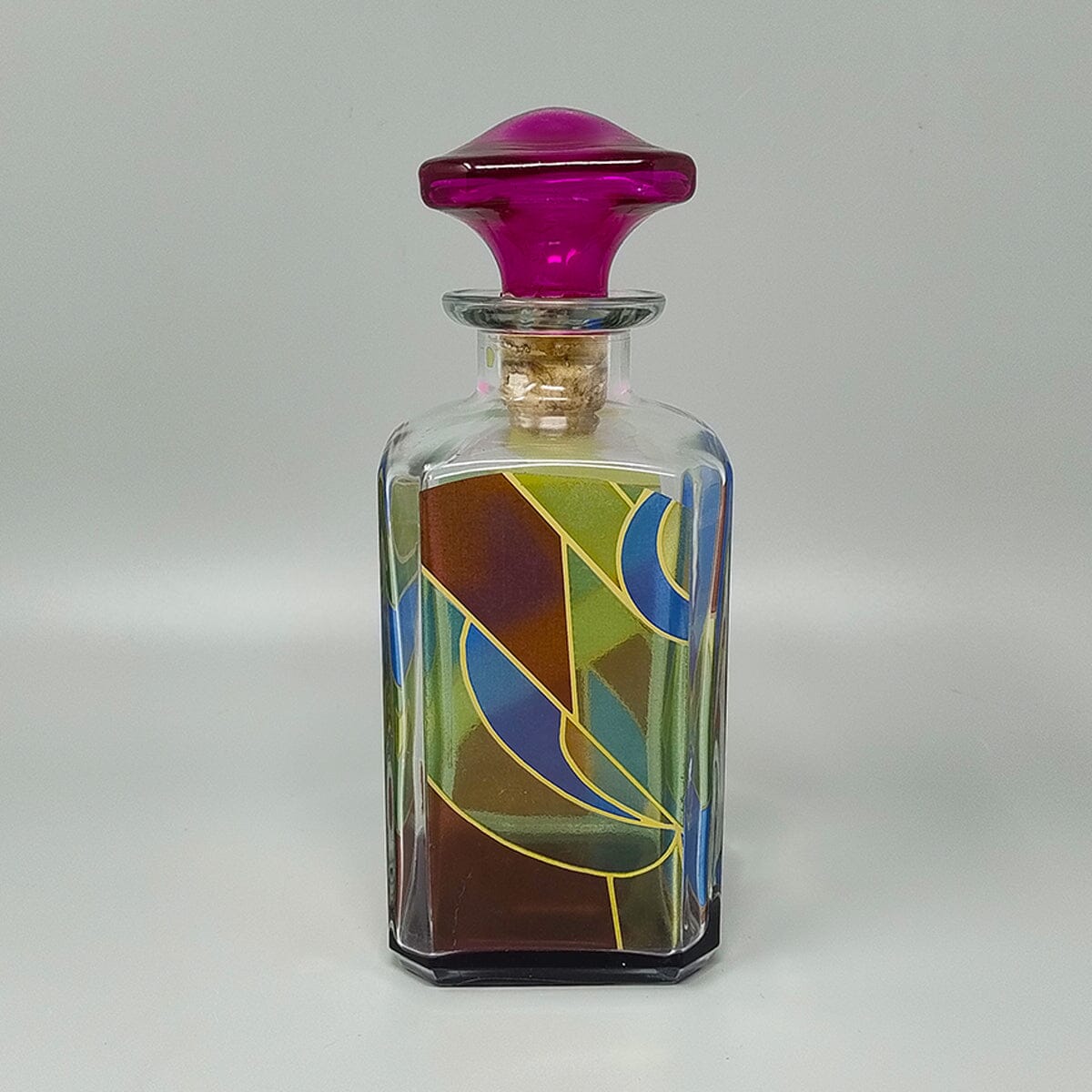 1970s Stunning decanter or decorative bottle colored in crystal by Luigi Bormioli. The colors are amazing. Made in Italy. It's in excellent condition.